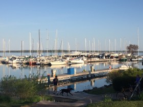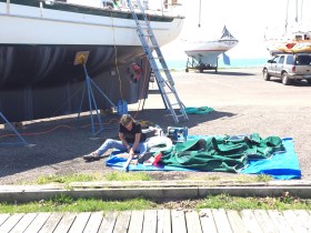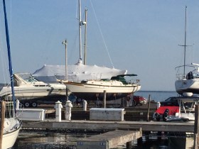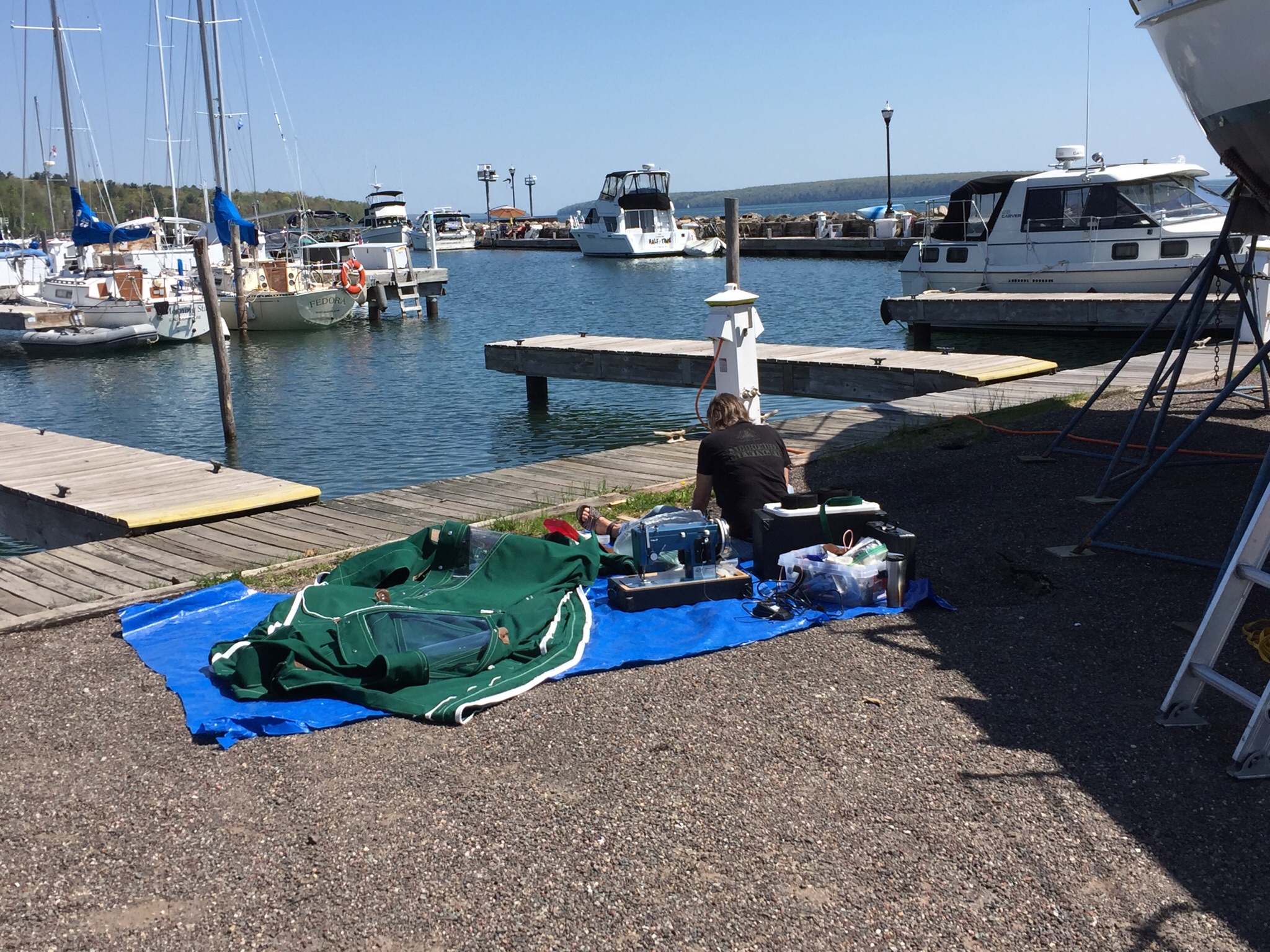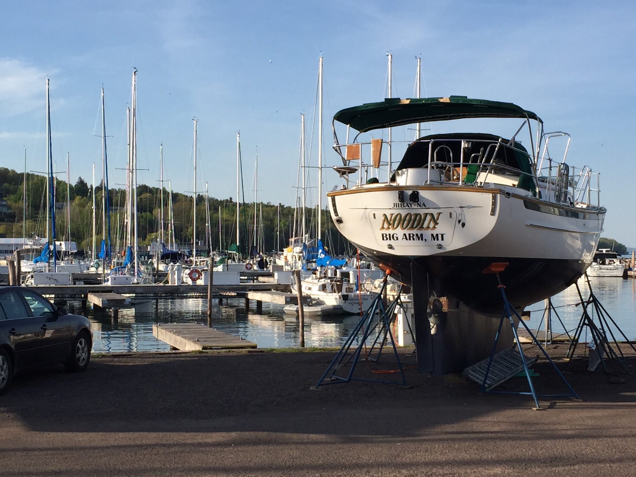 We got the rental house cleaned out and hit the road last Tuesday. We had several stops along the way to visit family and arrived in Bayfield Saturday. Our first view of Lake Superior at Duluth gave us both butterflies. Noodin had already arrived and was waiting for us at the Apostle Islands Marina in Bayfield. It’s a very protected Marina right in town and should be conveniently located. We got some work done today and will move aboard (on the hard) tomorrow. Hopefully we’ll launch in a week or so and can begin exploring by water.