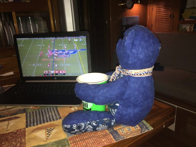 For us Georgetown is a special place because that’s where our cruising dream started most of 20 years ago. That being said it’s not our favorite place to be this time of year because it’s crowded with hundreds of cruising boats in the harbour. A stop in Georgetown is a necessary evil as it’s the best place within hundreds of miles to buy groceries and other essentials. We were in and out pretty quick and were off to Cat Island immediately after the passage of another cold front. The night before leaving Georgetown we were able to stream the Super Bowl on our laptop. The picture was small but the nachos and IPA’s were wonderful.