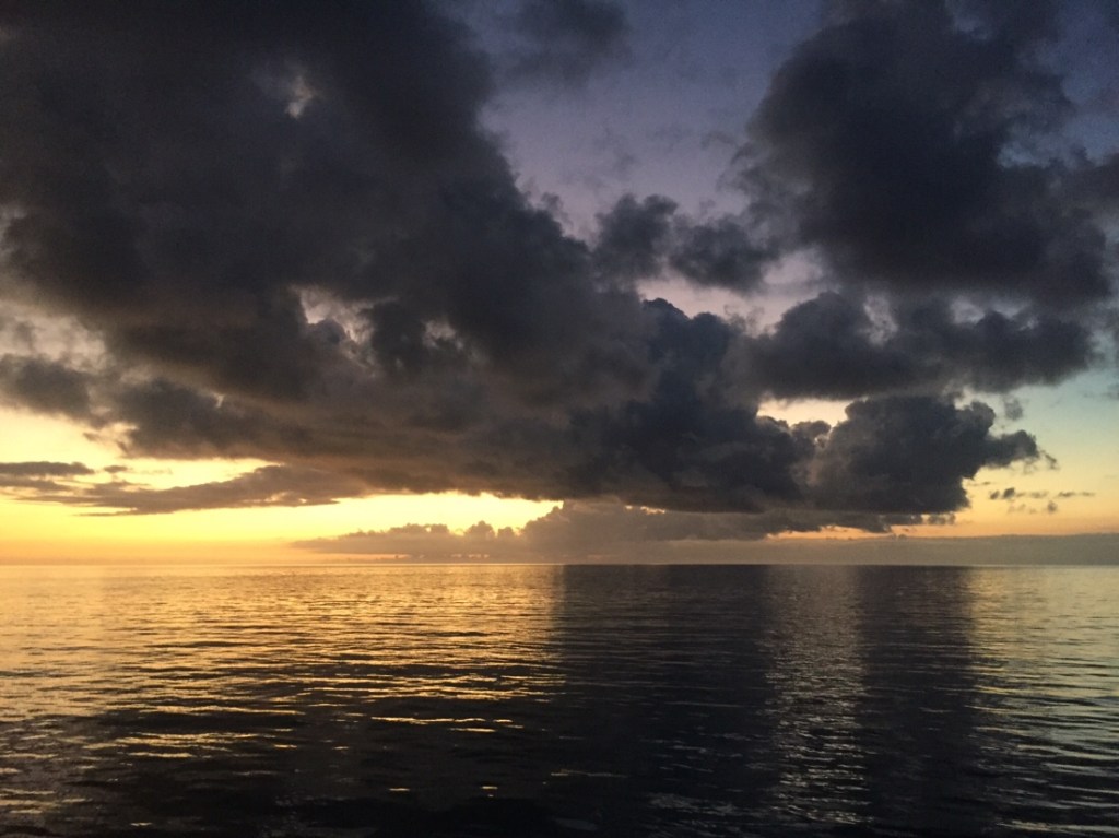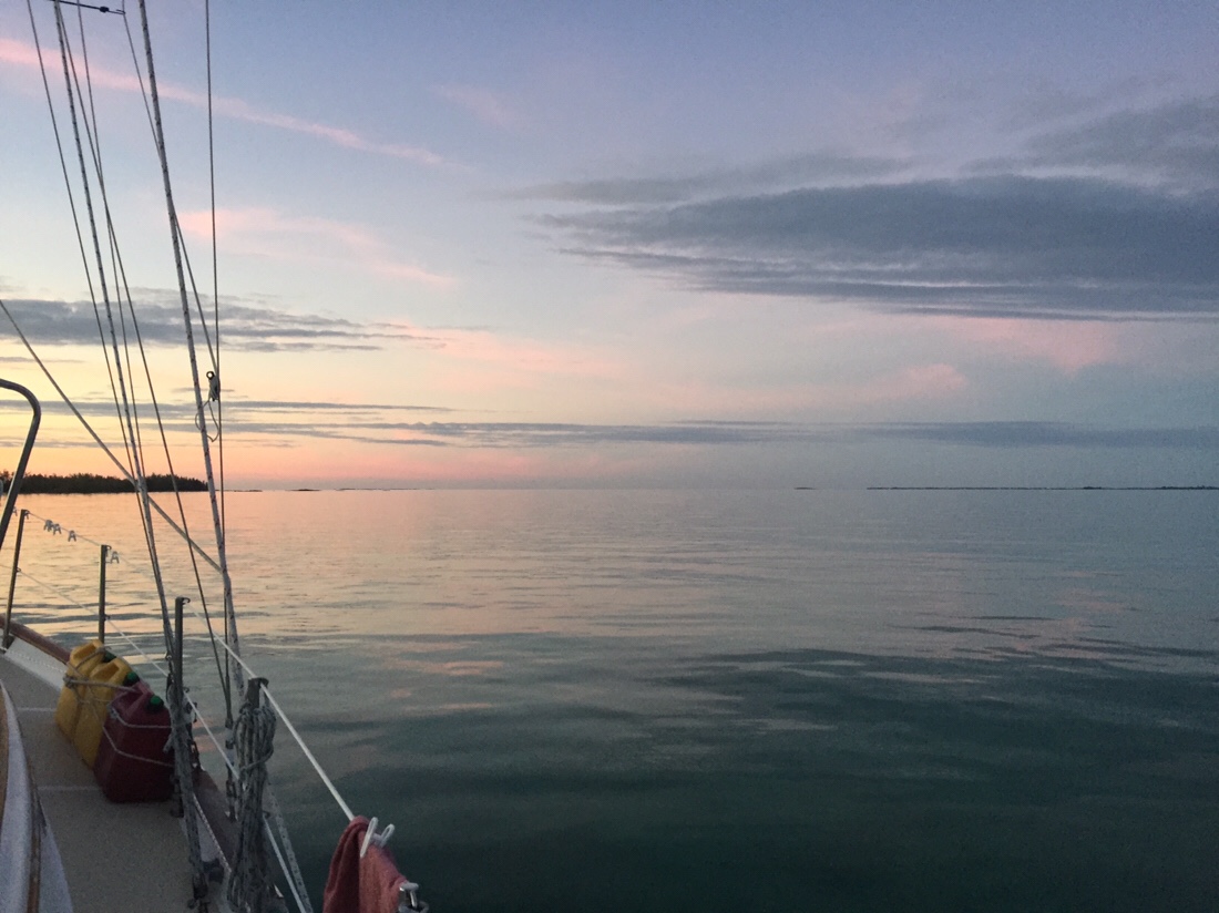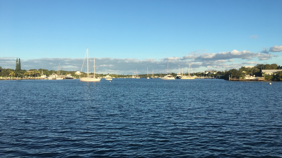 We had waited 10 days for a weather window to cross the Gulf Stream and go to the Abacos in the northern Bahamas and today was the day. It’s not a terribly long crossing but what makes it special is the Gulf Stream current. In this area the Gulf Stream is about 30 miles across and flows north at up to 4 knots. Even a moderate north wind (blowing opposite to the current) can create large, steep waves. Fortunately, we didn’t have that. Unfortunately ,we also didn’t have enough wind to sail either so we had to motor across. Without wind in the sails to stabilize the boat, the 4′ to 6′ seas made for quite a rolly crossing. We made it across the Stream and onto the Little Bahama Bank shortly after dark under a half moon and a star lit sky. We picked up plenty of wind but it was from directly behind us. This made it impossible for us to sail in the dark so on we motored. We took 3 hour watches through the night as the off watch person would try to get some sleep below. Phebe had the sunrise watch and enjoyed a beautiful Bahamian sunrise. We had been traveling for 24 hours at this point and had covered 160 nautical miles. 30 miles later we were tied up to a mooring ball in Black Sound on Green Turtle Cay. We had gotten in too late to make it in to customs to clear in so we were “forced” to stay aboard under the quarantine flag. The “Q” flag shows that we hadn’t cleared customs and weren’t yet legally in the country. Not a problem. We were just happy to have arrived in the Bahamas and to be tucked away in a very safe harbour after 30 hours and 190nm.