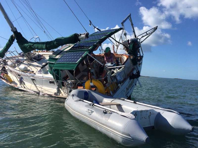 After taking the carburetor apart more times than I can count we finally gave up on it and decided to get a new one. This ended up being quite the process but it gave us a chance to meet more wonderful people. We went to Marsh Harbour hoping to pick up our new outboard and ran aground on a hard shoal near the commercial port. The chart showed 10′ of water but it was more like 3′ at low tide. What a surprise to be grinding to a halt. Another of those “What the hell?” moments. We tried everything we could think of to get ourselves off as the tide was falling but couldn’t get it done. Noodin kept heeling more and more as the tide fell. Neither Noodin or her crew were in any real danger but it was damn uncomfortable.